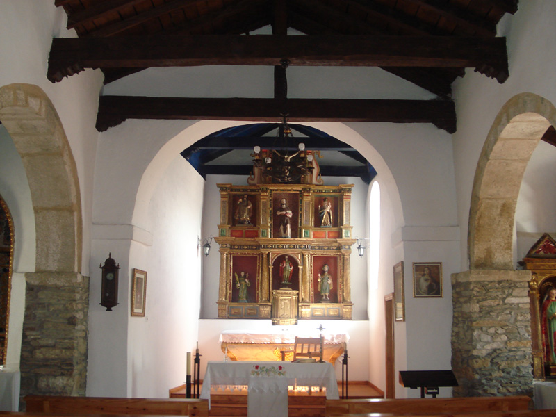 En el arco toral hay un Cristo barroco. El retablo mayor tiene tres calles con cuerpos, el primero con estrías en espiral del siglo XVII y el segundo añadido en el sigloXVIII. En el ático se conserva un Santiago Peregrino de resonancias románicas, siendo las demás imágenes barrocas y de cierto mérito.